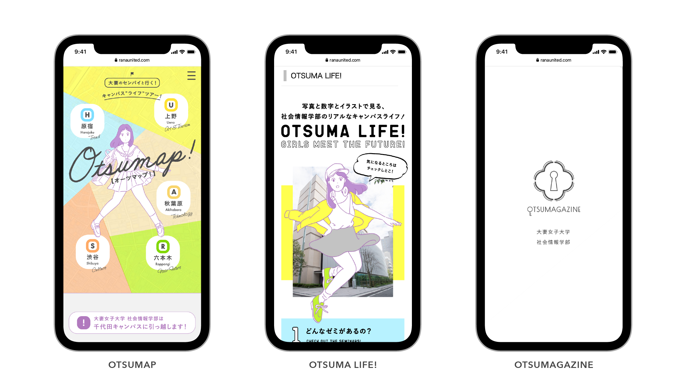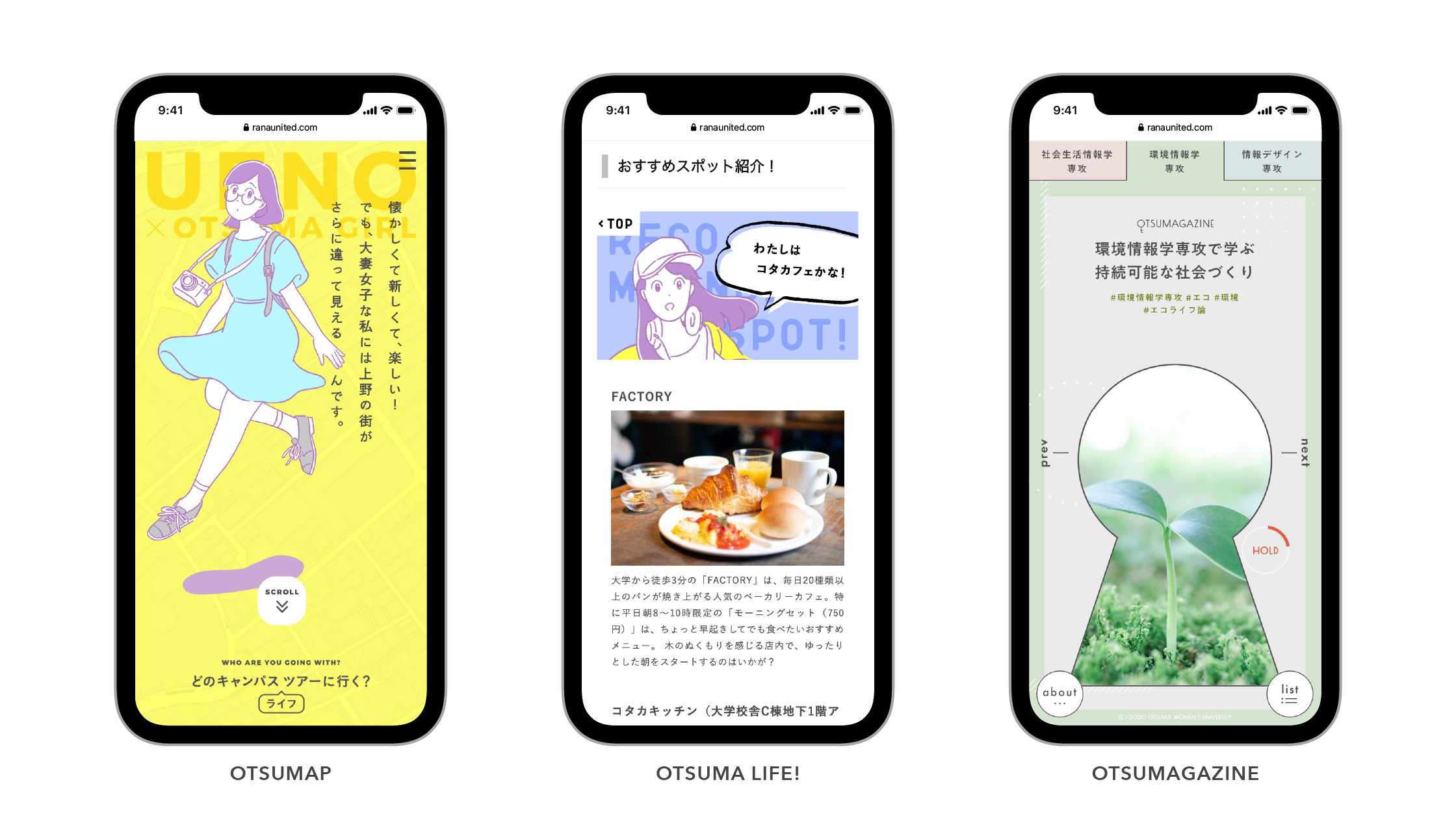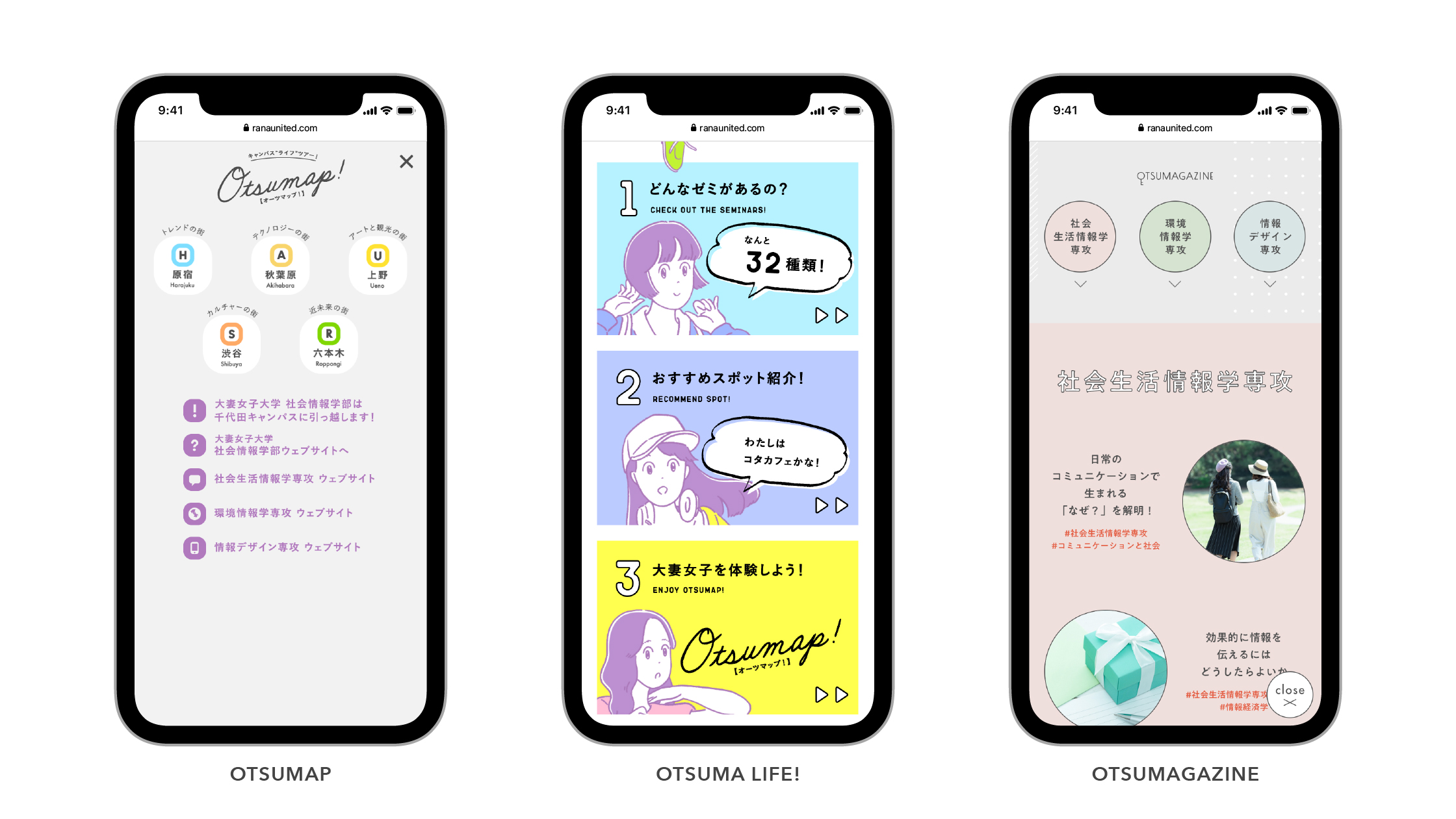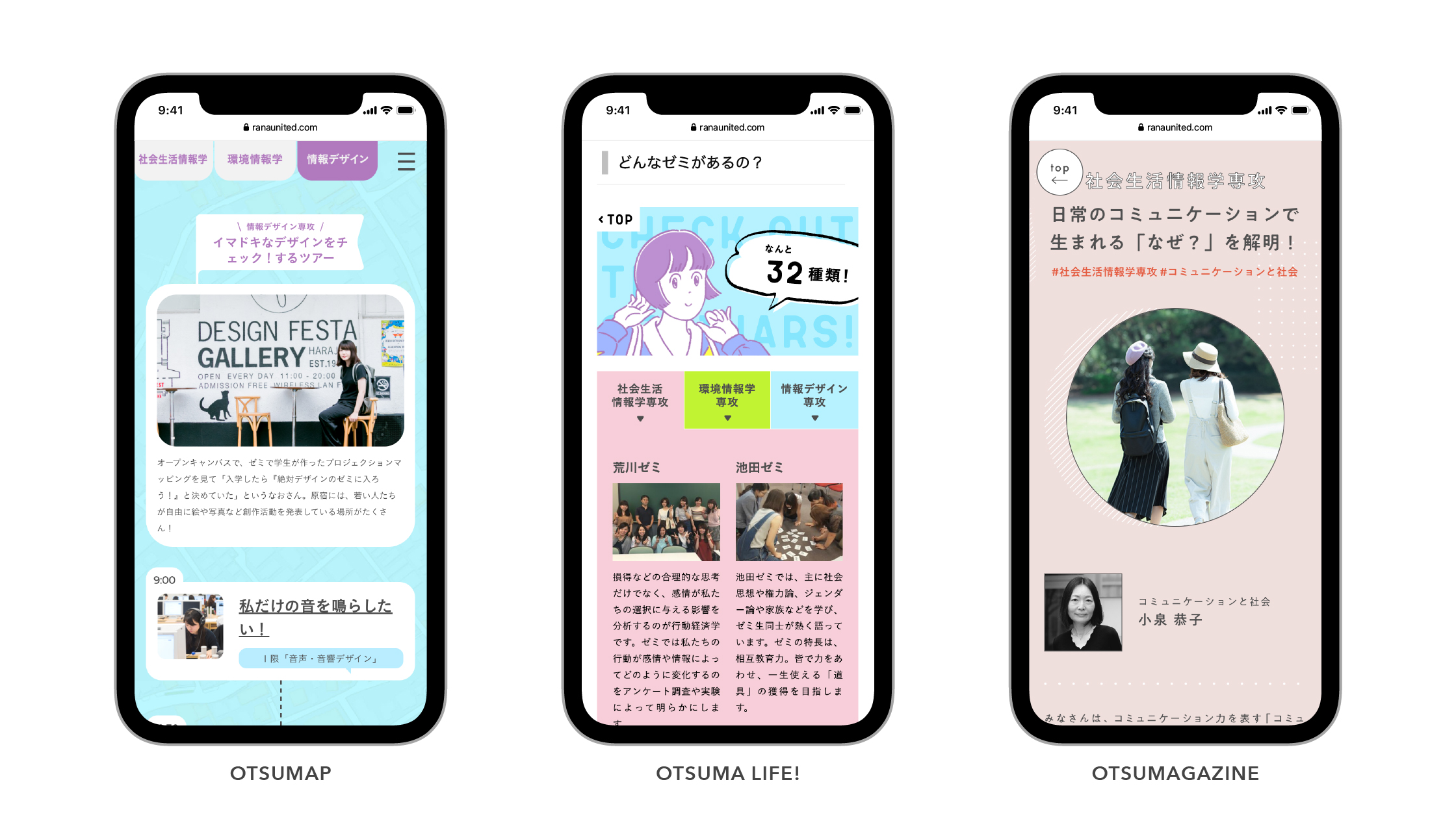 キャンパスライフにフォーカスした「Otsumap!」「OTSUMA LIFE!」では、イラストをメインにしたポップで楽しいデザインで明るいキャンパスライフを想起させる設計にしました。一方、社会情報学部での学びにフォーカスした「OTSUMAGAZINE」では、実際の授業の「覗き見」をコンセプトに、知識欲をかき立てるコンテンツとデザインにすることで、ライト層〜コア層まで幅広いターゲットにアプローチできる構造にしました。