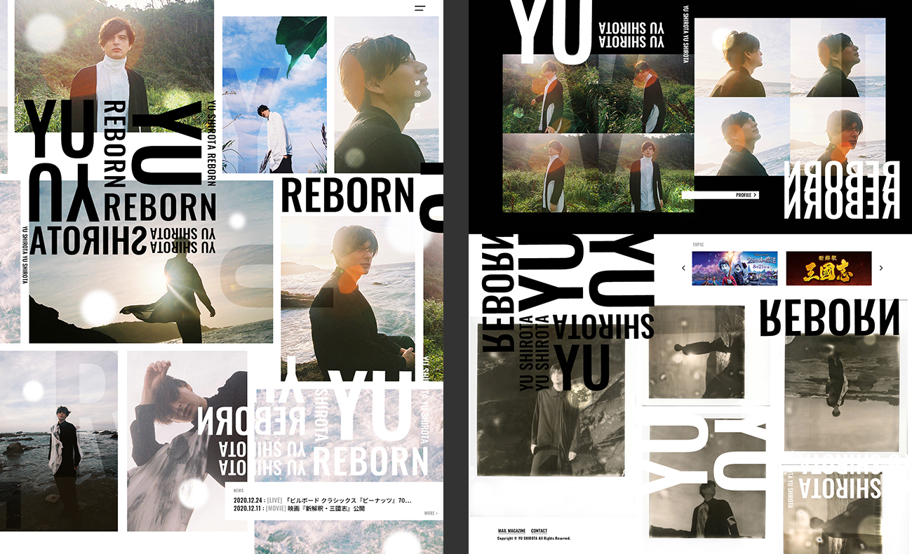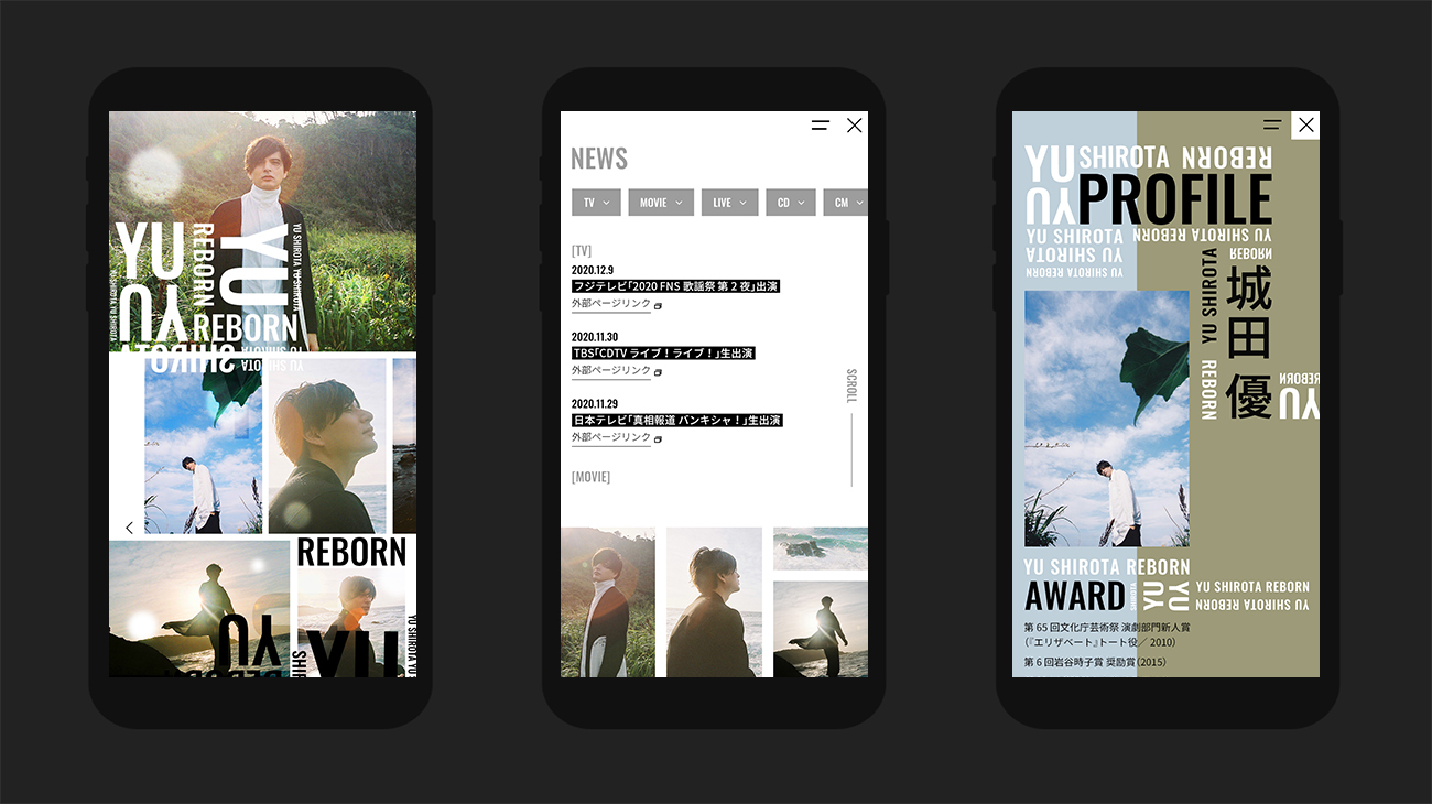 元々のオーダーは写真2〜3カットで構成するシンプルなサイトでしたが、「REBORN」をコンセプトに城田さんの新たな表情・魅力を伝えるため、タカコノエルさん撮り下ろしの写真をページ全体に敷き詰めたデザインを提案。ページ遷移をpjaxで処理し、サイト全体をシームレスに移動できるようにしています。
