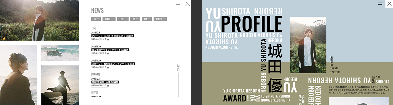 TOPページは写真を中心としたギャラリー的な見せ方、プロフィールページは文字を中心としたタイポグラフィ的な見せ方にすることで、より印象に残るデザインに仕上げました。公開直後からSNS上でファンの方達を中心に多くのご好評の声をいただきました。